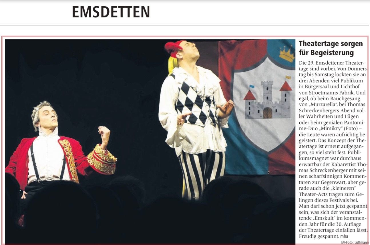 “.. erstklassige Show ..” “Das Duo Mimikry begeisterte durchweg …” Cellesche Zeitung 11.10.2018 |